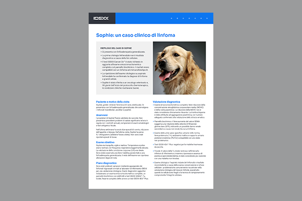 Lea este caso clínico sobre Sophie, una golden retriever de 5 años cuyo resultado de la prueba IDEXX Cancer Dx fue compatible con linfoma.